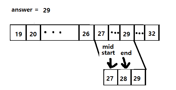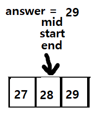 마지막 mid는 28이고 person 값은 4+2 = 6으로 answer는 28이 되고 while문을 빠져나가게된다.