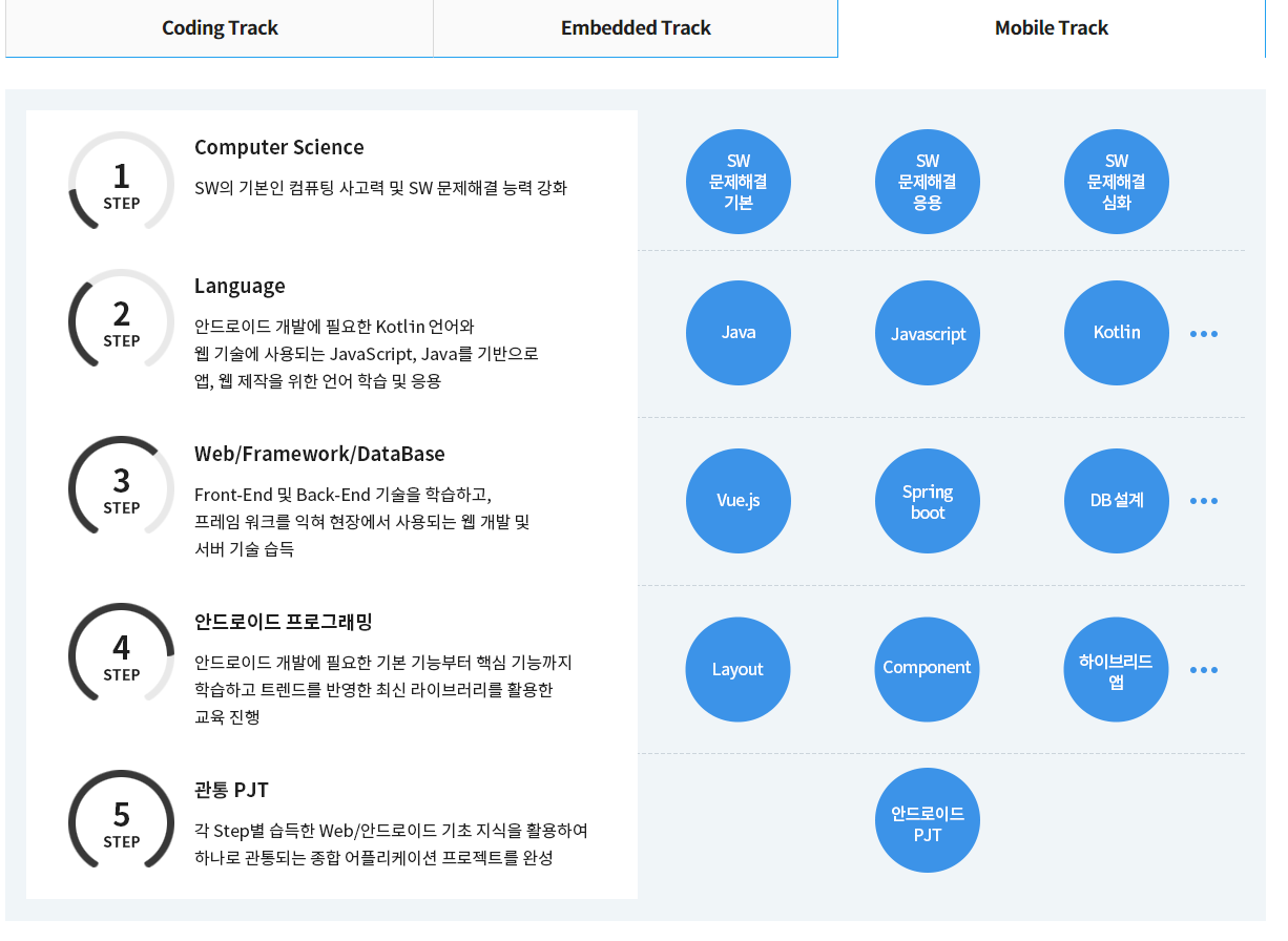 싸피는 모바일을 배우면서 프론드엔드, 백엔드도 배워서 웹앱이나 하이브리드 앱을 만들 때나 다른 개발자와 협업할 때 도움이 될것이라고 생각했습니다.