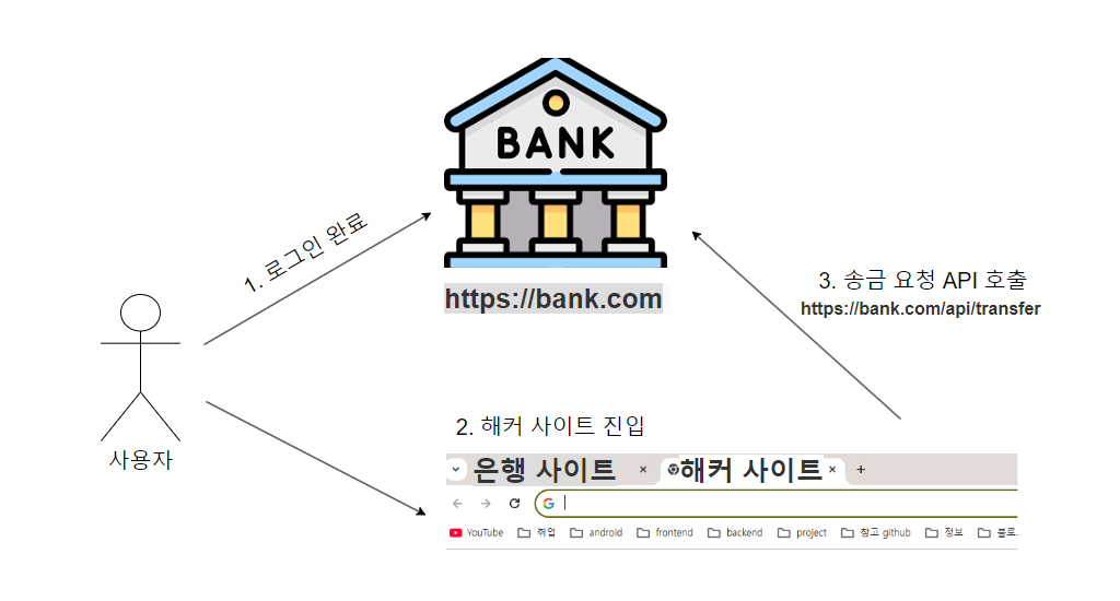 해커의 사이트에서 은행으로 송금을 요청하는 API를 요청한다.