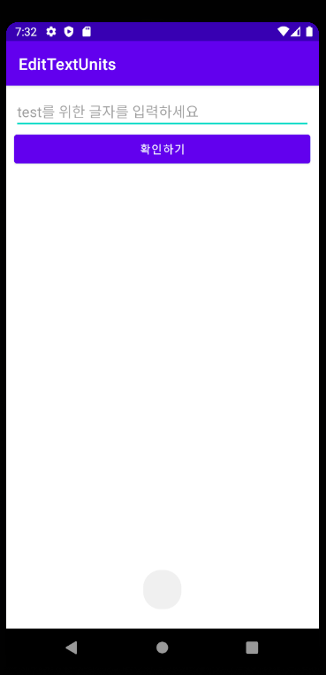 <?xml version="1.0" encoding="utf-8"?> <LinearLayout xmlns:android="http://schemas.android.com/apk/res/android" xmlns:tools="http://schemas.android.com/tools" android:layout_width="match_parent" android:layout_height="match_parent" android:orientation="vertical" android:layout_margin="10dp" tools:context=".MainActivity"> <EditText android:id="@+id/edittext" android:layout_width="match_parent" android:layout_height="wrap_content" android:hint="test를 위한 글자를 입력하세요" /> <Button android:id="@+id/button" android:layout_width="match_parent" android:layout_height="wrap_content" android:text="확인하기" /> </LinearLayout>